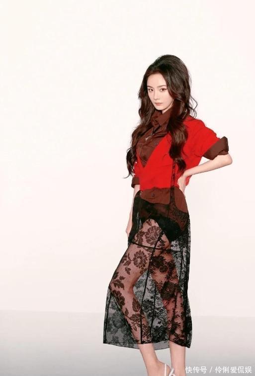 还有一套更迷惑的,上身是酒红色衬衫搭配红色针织开衫,复古感是有了,可下身居然配了一条蕾丝透视裙,还搭了一双白色凉鞋,冷热混搭就算了,风格也完全不搭,怎么看怎么怪,说不出的违和感。而且杨幂那个姿势,家人们你们品一品,是不是像闪了腰?僵硬又奇怪,一点都不自然。