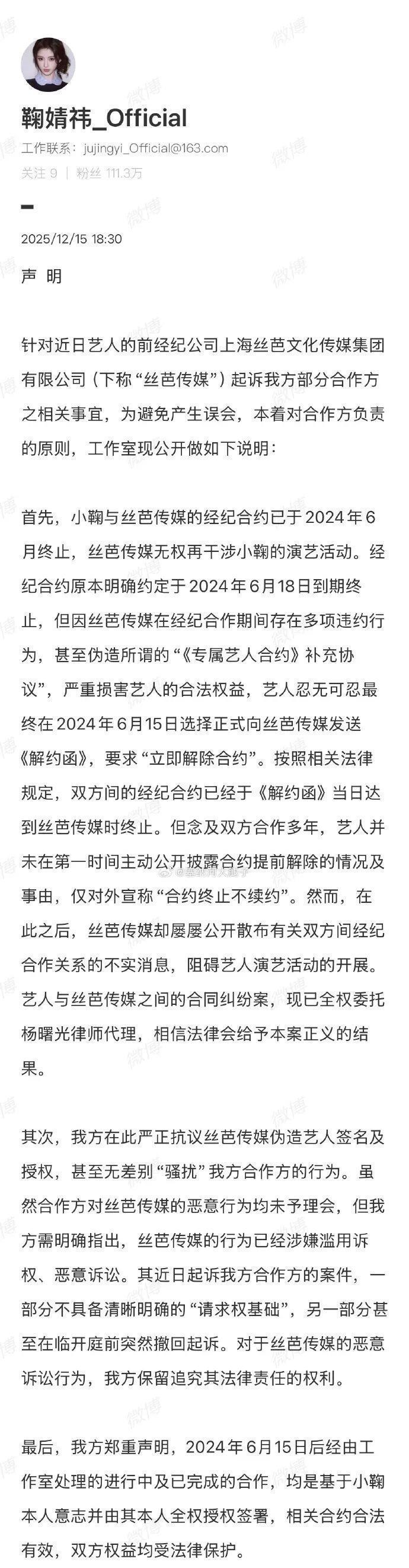 2025年12月15日,鞠婧祎工作室发布声明,首次披露2024年6月合约终止的完整内幕,指控前经纪公司丝芭传媒伪造协议、骚扰合作方。工作室声明称,原合约约定2024年6月18日到期,但因丝芭传媒存在多项违约行为(包括伪造《专属艺人合约》补充协议),鞠婧祎于2024年6月15日发送《解约函》,法律上合约当日终止。为维护合作体面,艺人方此前仅对外宣称“合约到期不续约”,未公开解约细节。丝芭传媒反称通过2018年补充协议将合约延至2033年,但工作室驳斥该协议系伪造,艺人从未签署,并已于2024年7月起诉申请笔迹鉴定。