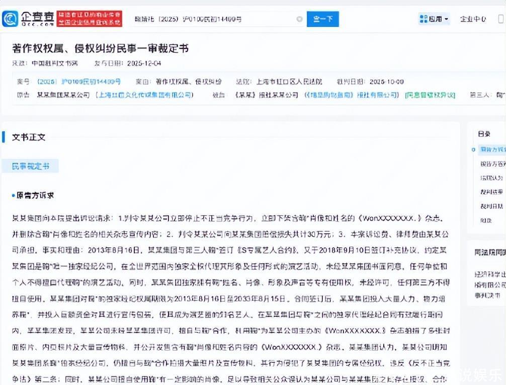 丝芭在起诉状中称,2013年与鞠婧祎签订《专属艺人合约》,并于2018年签署补充协议,约定其作为唯一独家经纪公司,拥有鞠婧祎姓名、肖像等专有使用权至2033年8月15日。据此要求杂志社下架含鞠婧祎肖像的宣传内容并索赔30万元。