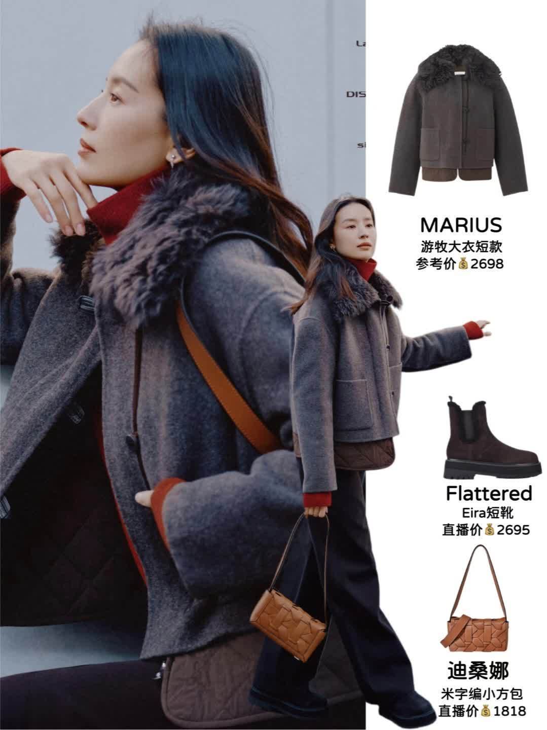 游牧松弛风 | MARIUS游牧大衣+切尔西短靴,下装选黑色阔腿裤+切尔西靴,打造随性又利落的造型。深灰色毛领大衣自带质感,短款设计显高不压个子,内搭红色高领衫增加层次感。