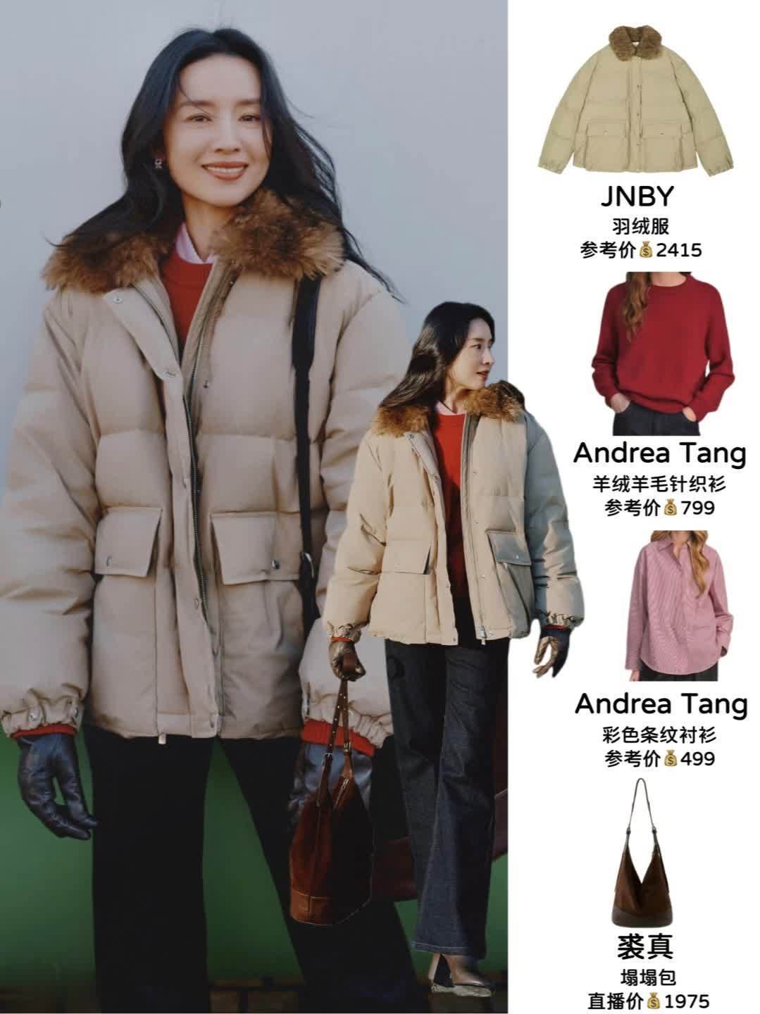 实用保暖风 | JNBY羽绒服+红色针织衫,卡其色羽绒服百搭不挑人,毛领设计提升保暖性,内搭红色针织衫点亮整体,下装选深色牛仔裤+皮靴,日常又耐看。