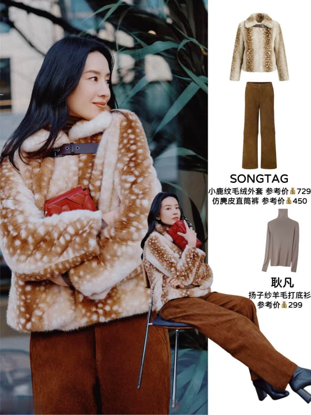 甜酷小鹿风 | 小鹿纹毛绒外套+仿麂皮直筒裤,小鹿纹毛绒外套暖调小鹿纹自带冬日暖意,搭配同色系直筒裤打造“上宽下宽”的松弛感,红色手拿包,一抹亮色让整体造型更有记忆点。