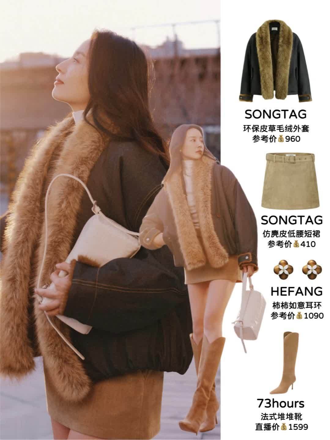 复古摩登风 | 环保皮草毛绒外套+低腰短裙,大翻领皮草外套自带贵气感,搭配低腰短裙和堆堆靴,打造“上繁下简”的视觉效果。