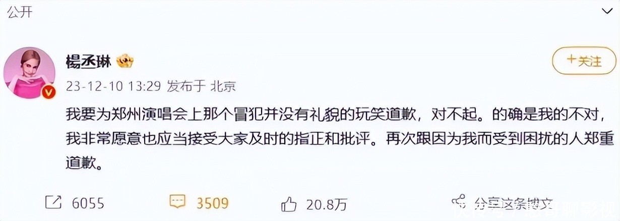 “我要为郑州演唱会上那个冒犯并没有礼貌的玩笑道歉,对不起。的确是我的不对,我非常愿意也应当接受大家及时的指正和批评。再次跟因为我而受到困扰的人郑重道歉。”
