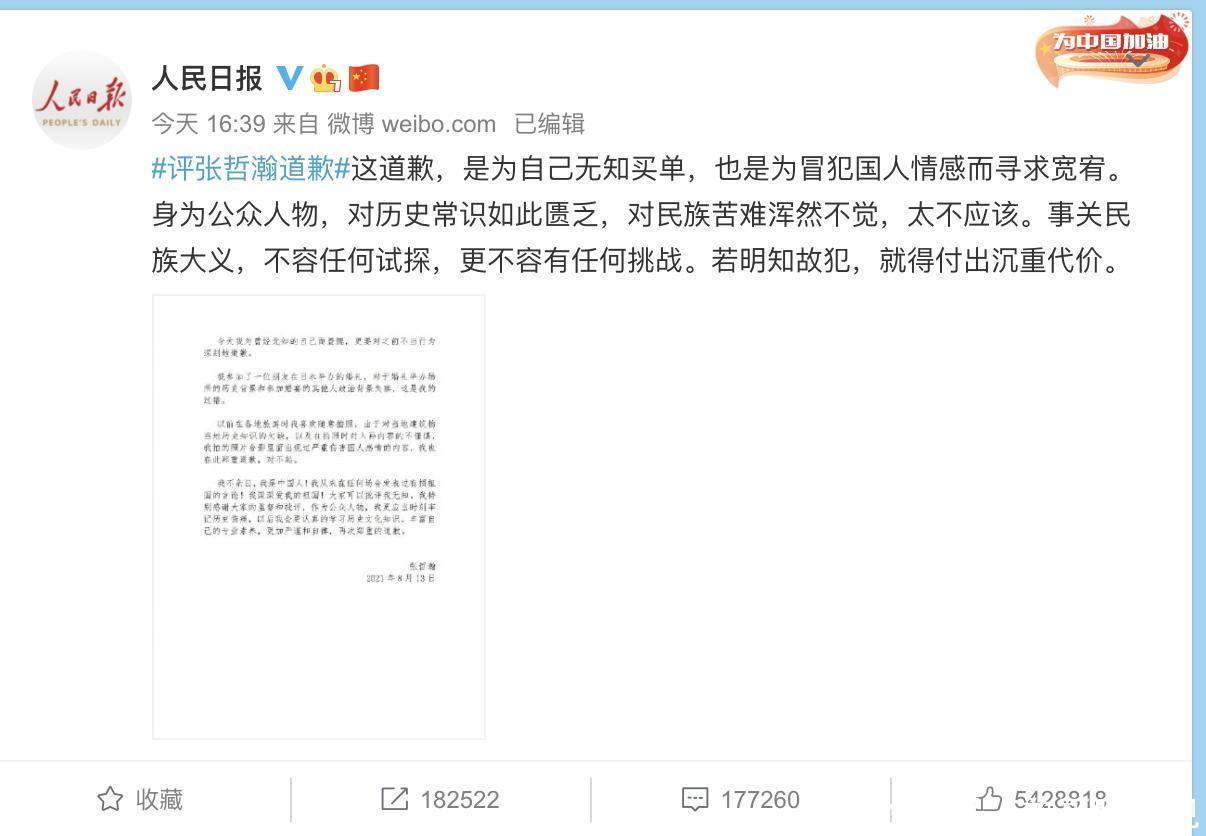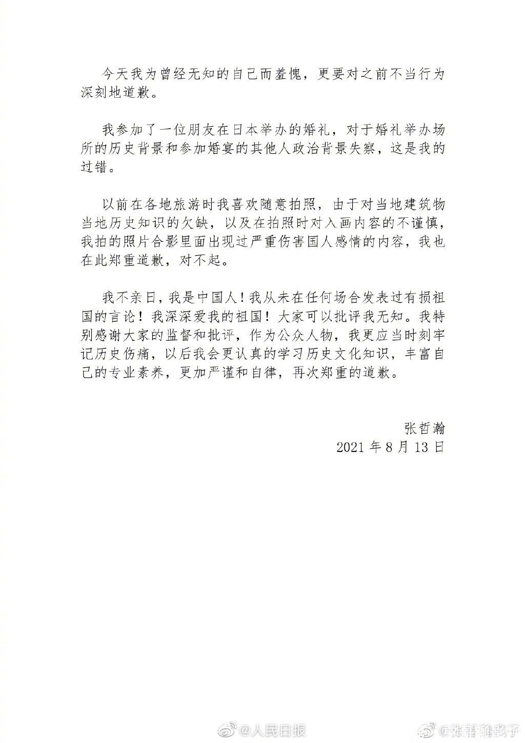 事件曝光后,张哲瀚在微博发表道歉声明,称因为自己的无知才犯下错误。