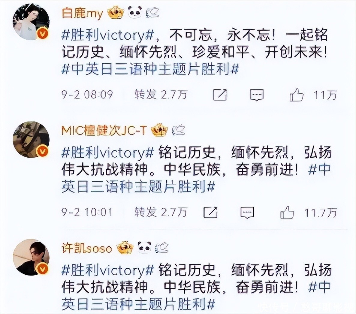 内地明星集体转发官媒纪念内容、演唱纪念歌曲,以行动铭记历史。