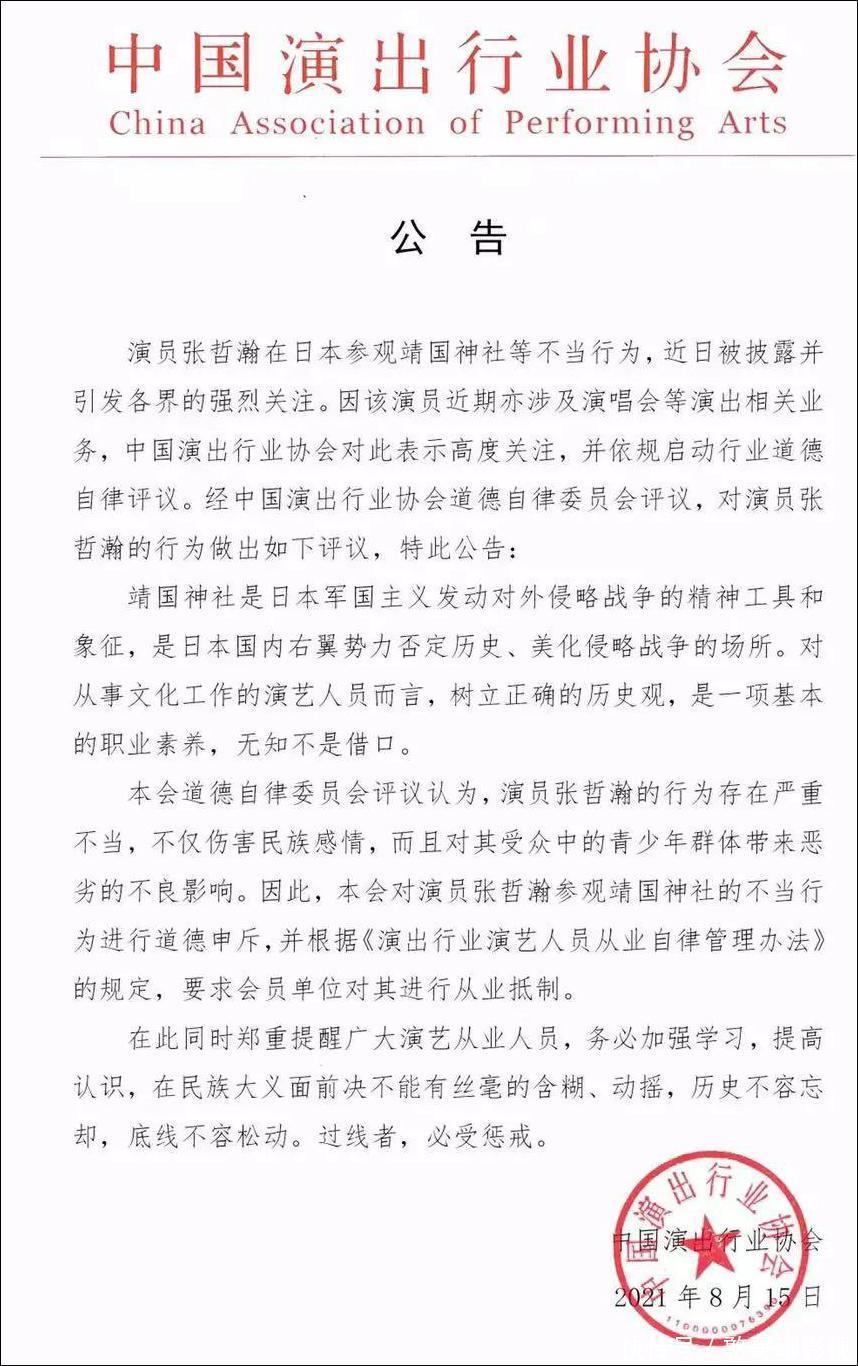 宣布对演员张哲瀚参观靖国神社的不当行为进行道德申斥,要求会员单位对其进行从业抵制。
